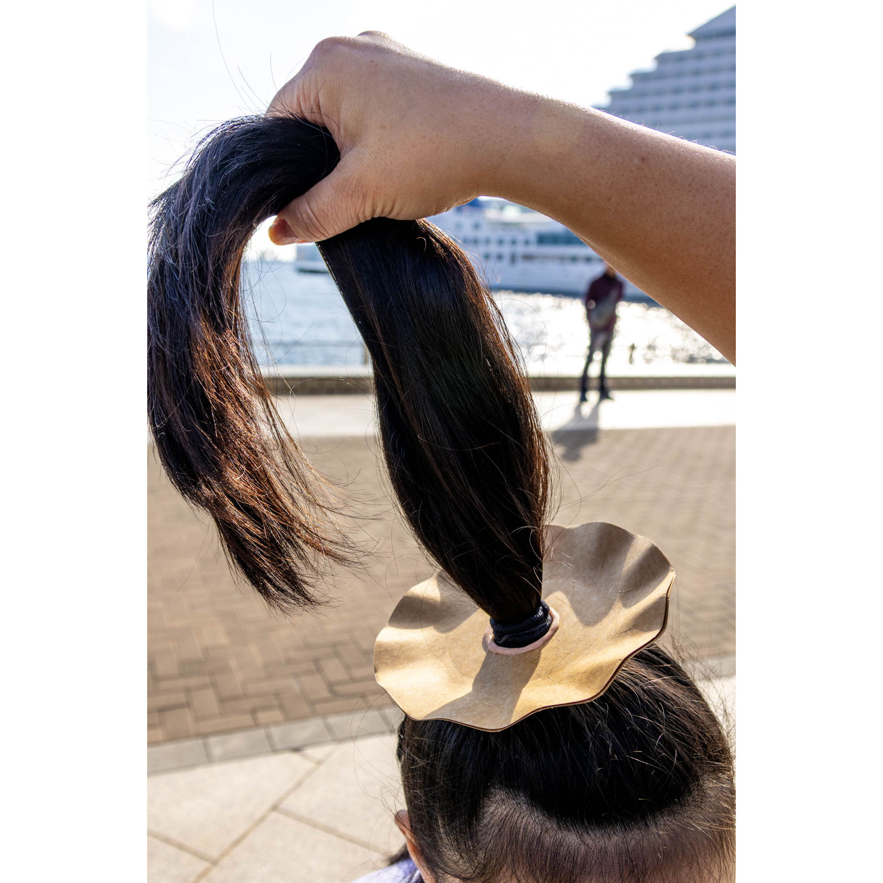 お皿の穴にお子様の髪の毛を通してピンで止めるだけ。