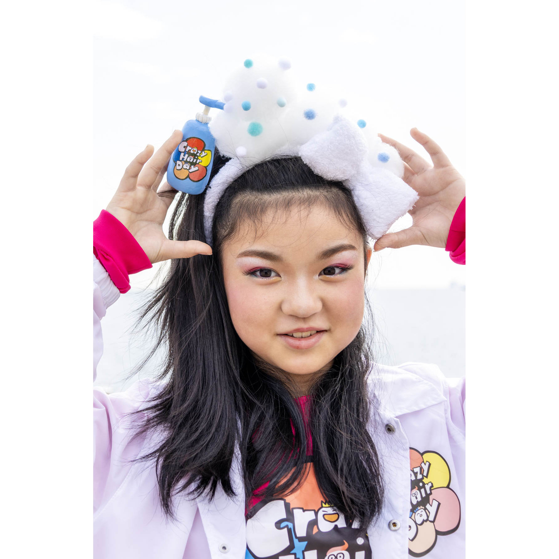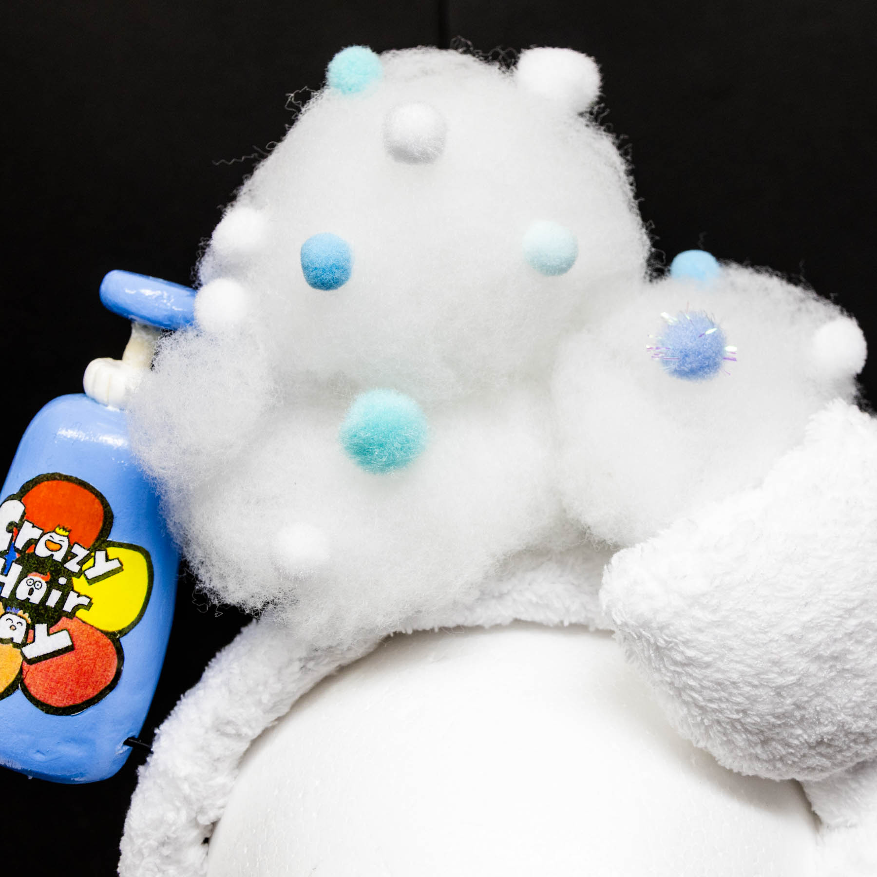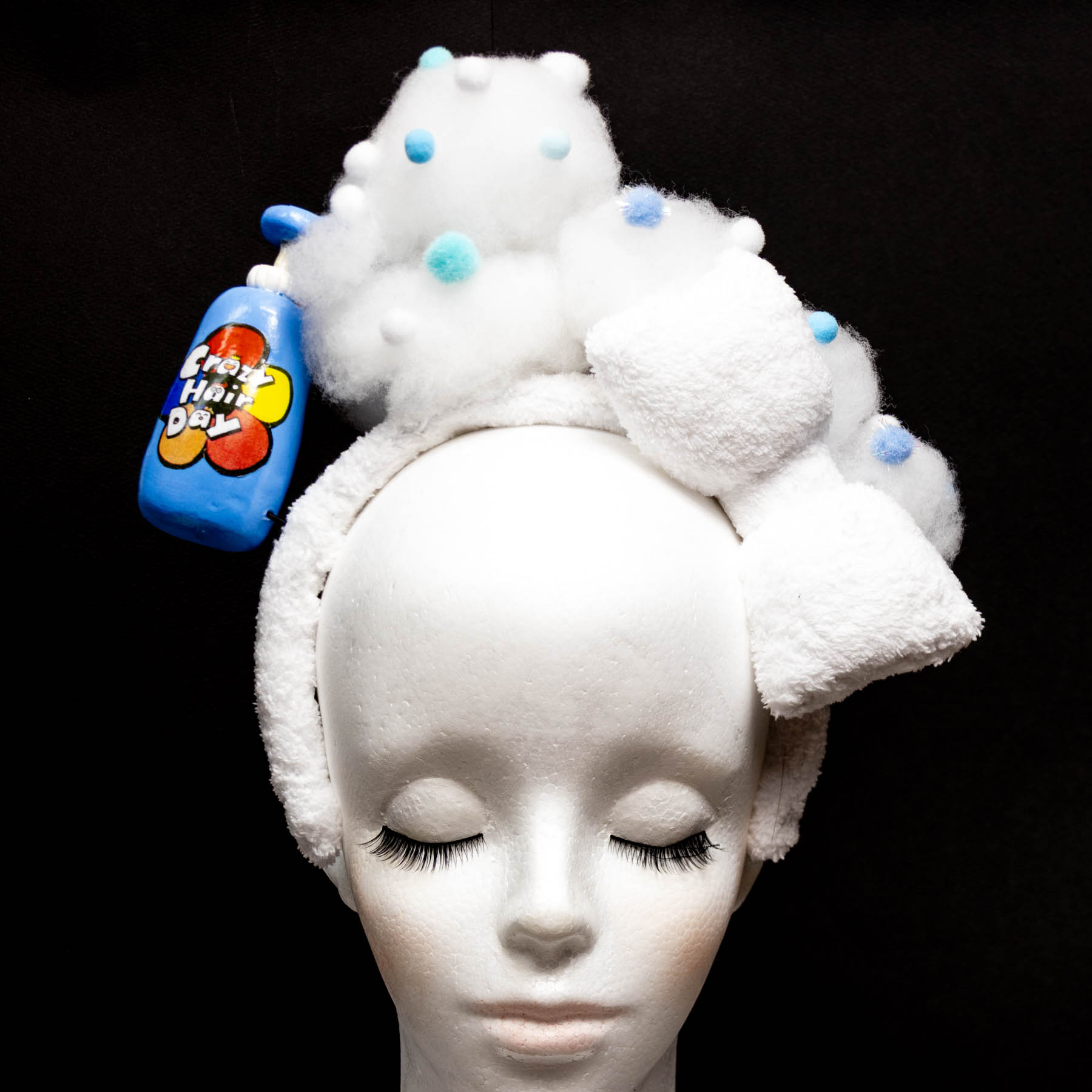 シャンプーの容器、泡はもちろん。カチューシャ自体も白いタオル地で覆われているファッショナブルな作品となっております。